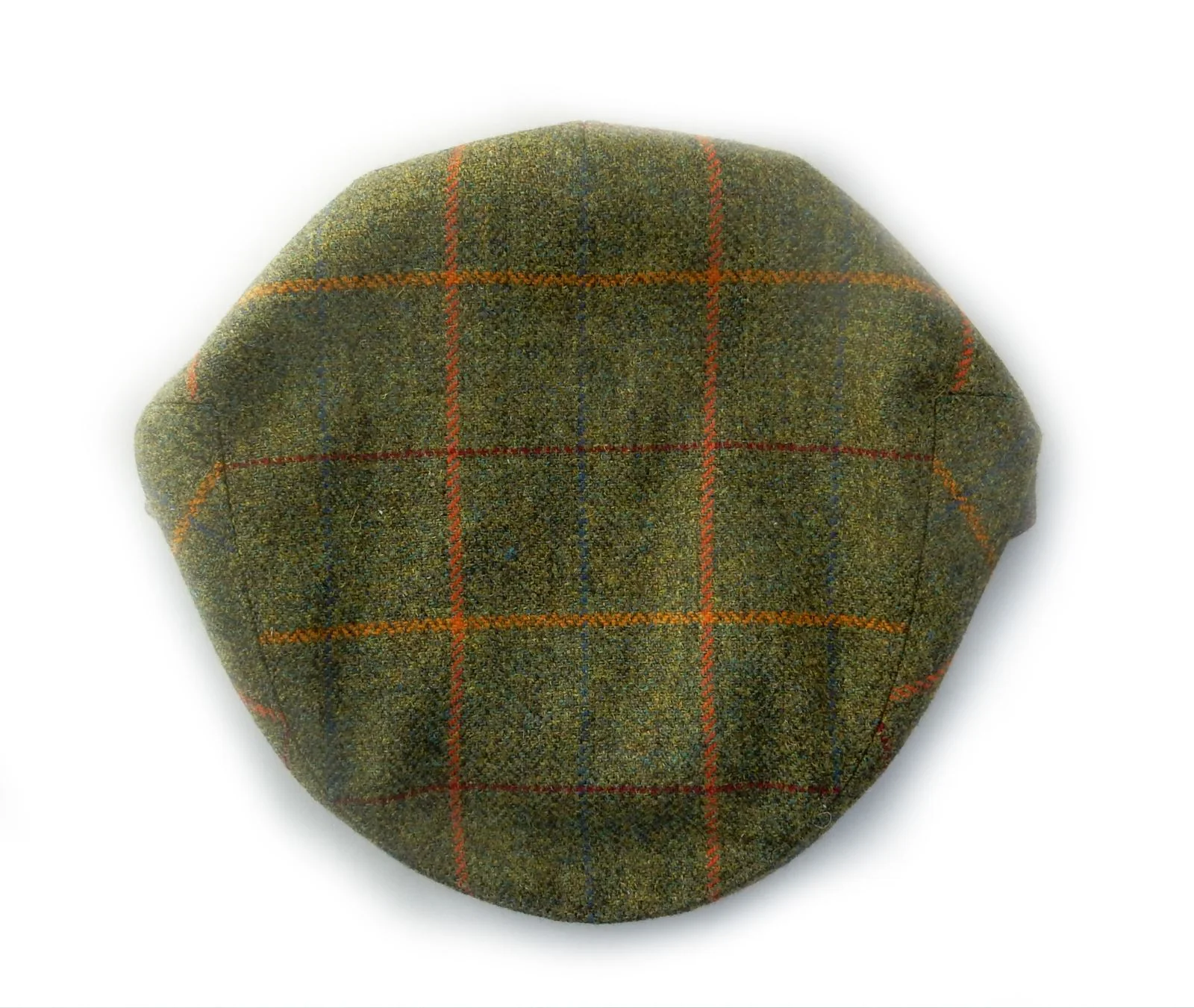Hand-tailored in Yorkshire, we love our Lawrence & Foster traditional flat caps. The dedicated craftsmen have created the Garforth cap, a classic flat cap shape with a deep back and crown. Finished in a traditional style with a hessian interlining and hand-sewn peak. Derwent Green is one of our most popular tweeds, a traditional green tweed with blue/orange/red overcheck.